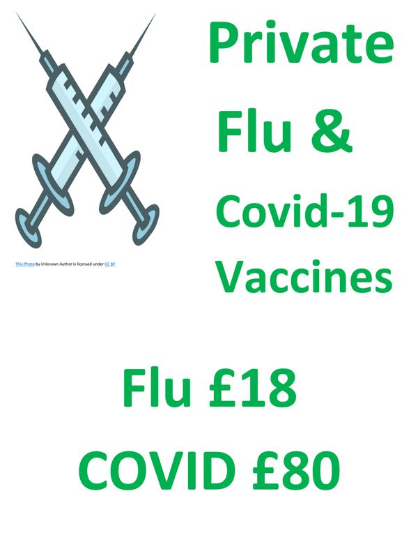 We offer private flu and COVID-19 vaccines to those* who are not eligible for the free NHS flu/COVID-19 vaccine this season.